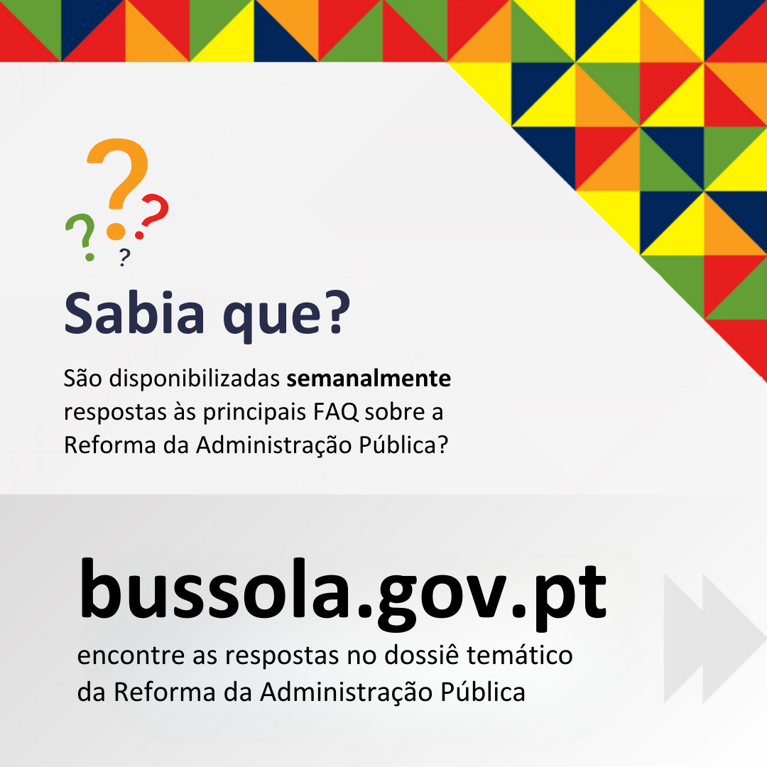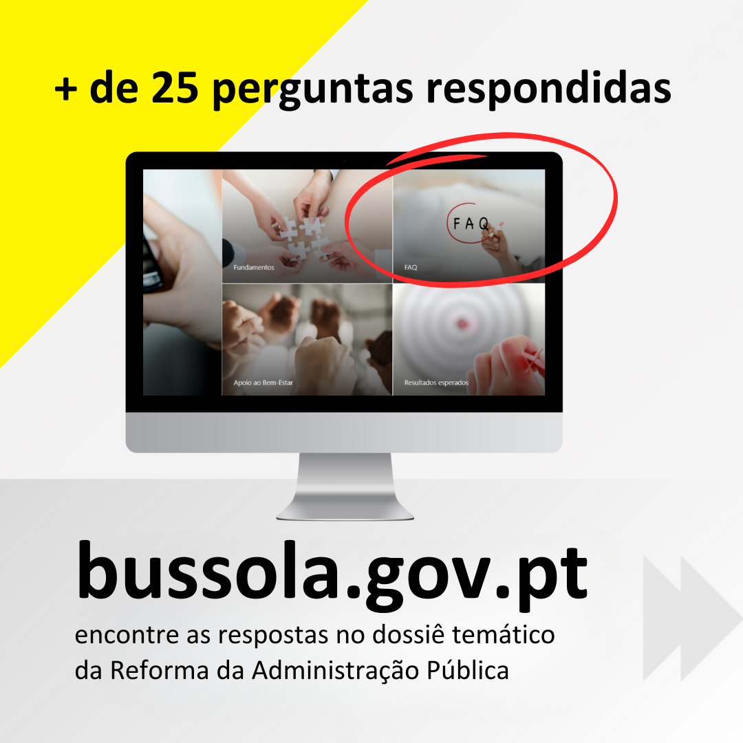 No âmbito da Reforma da Administração Pública, semanalmente são publicadas no portal da Bussola novas FAQ’s, em resposta às principais dúvidas e questões colocadas pelos trabalhadores da Administração Pública, com vista a prestar o maior número de esclarecimentos ao longo de todo o processo da Reforma.